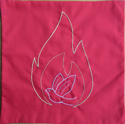 ![]() De Geest Met startzondag, sept 2025, hebben we als gemeenteleden geborduurde of geschilderde lapjes gemaakt. Met als thema De Heilige Geest. Die lapjes hebben een paar weken in de kerkzaal gehangen. Mijn lapje hing er ook bij. Rood. Want rood is de liturgische kleur van Pinksteren en de Geest. Daarom heb ik voor een rood "lapje" gekozen en daarop een vlam geborduurd. In Handelingen 2 lezen we over een soort vlammen en vuurtongen die zich verspreiden onder de mensen. "En allen werden vervuld met de Heilige Geest" zo staat er. In de vlam is een duif geborduurd als symbool van de Heilige Geest Trienke Flobbe. | ||